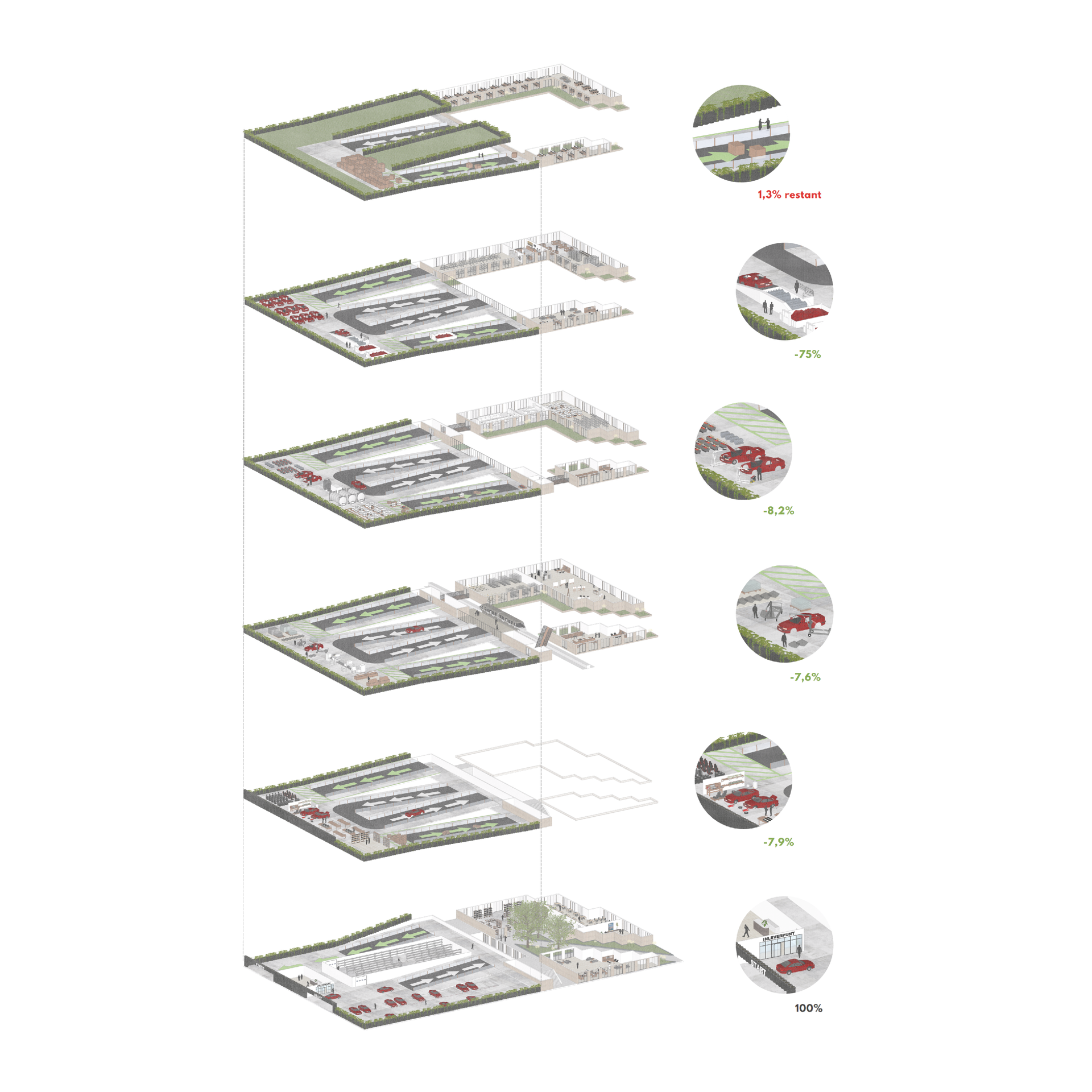 Transformatie van parkeergarage tot een auto-recyclefabriek als statement voor de autovrije stad, waarbij gerecycled materiaal wordt hergebruikt voor nieuwe producten en de biodiversiteit in de stad wordt versterkt.