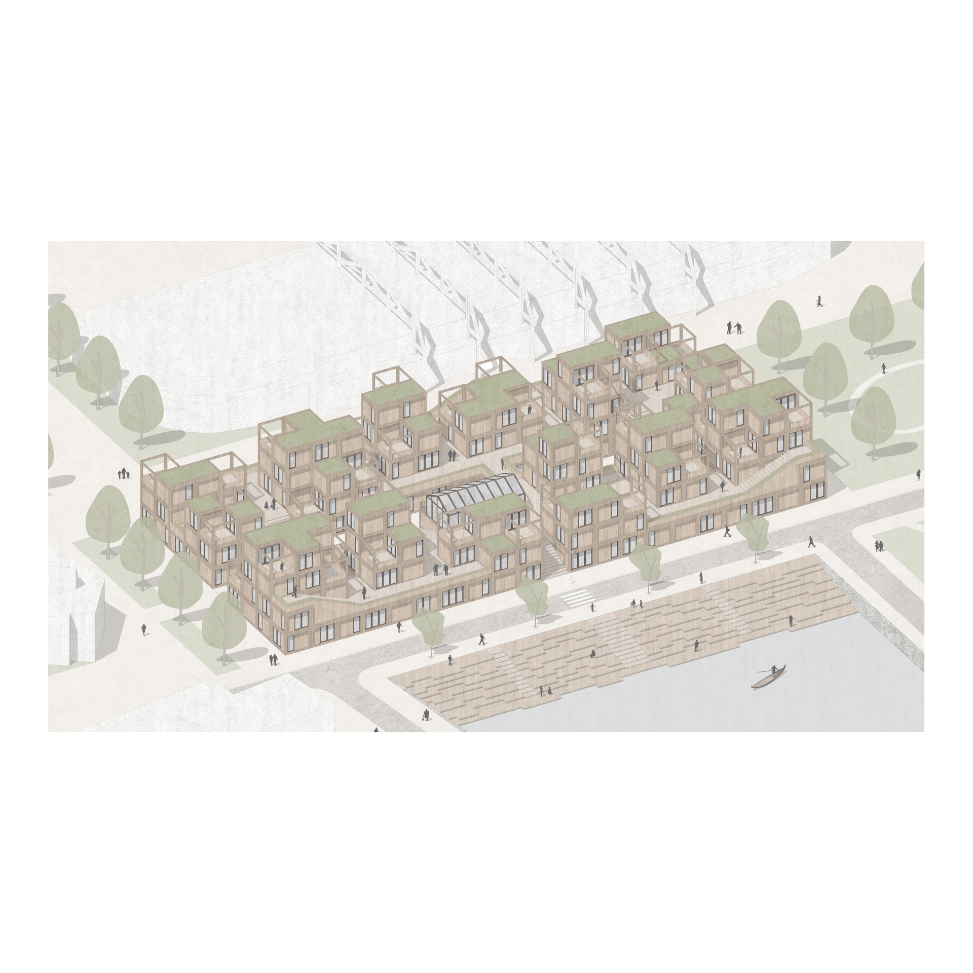 Ontwerp van 40 unieke sociale huurwoningen in Feijenoord, Rotterdam, met een modulair houten bouwprincipe, gebaseerd op het Community Land Trust-model, voor duurzame en betaalbare huisvesting.